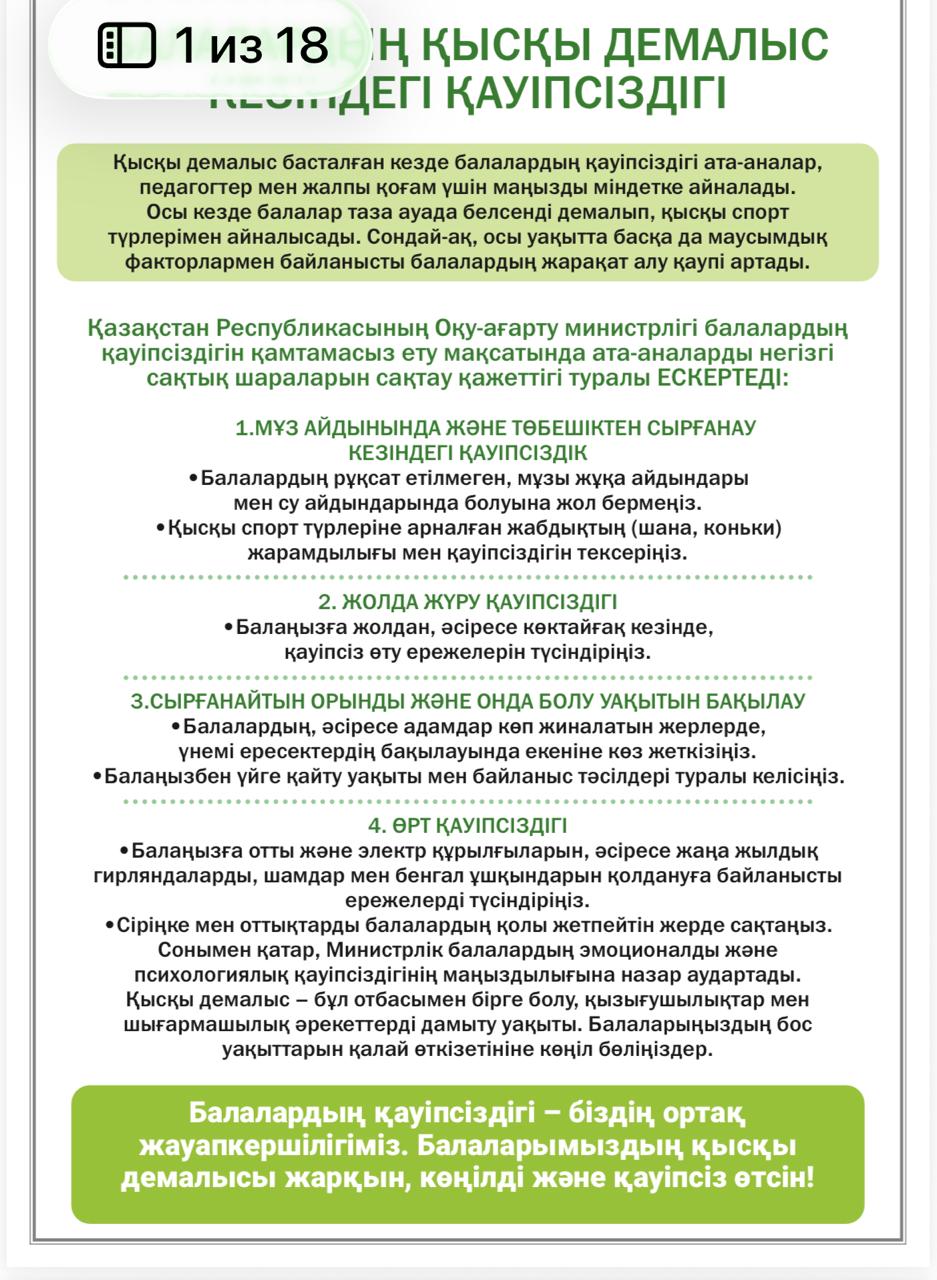 Балалар мен ата-аналарға арналған жадынамаҚысқы демалыс-демалу, серуендеу және мереке күндері. Олардың қуанышпен және оқиғасыз өтуі үшін қарапайым қауіпсіздік ережелерін сақтау маңызды.